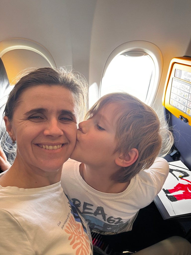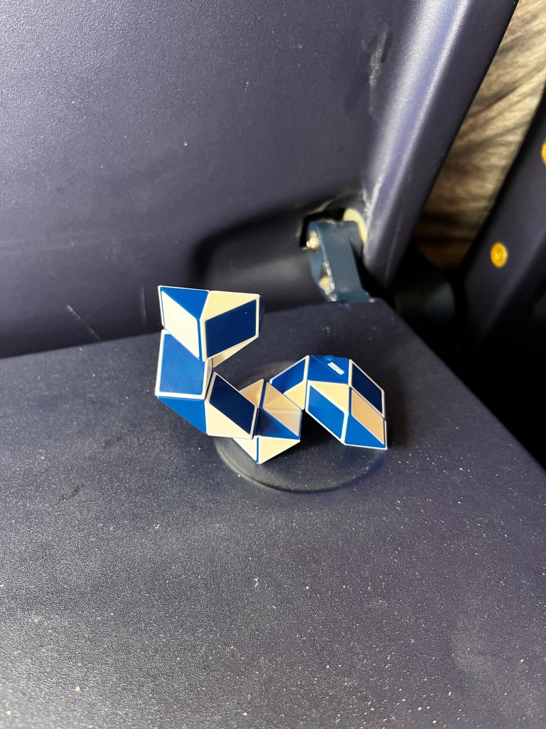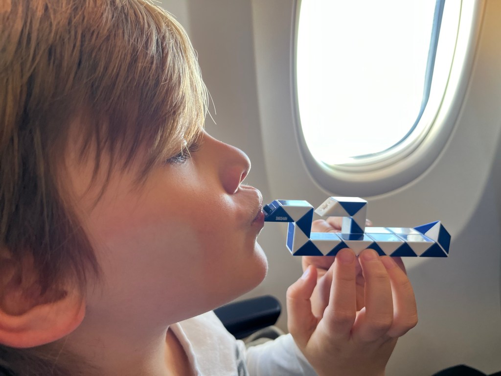 V lietadle sa Eliáš zabavil najprv pozeraním seriálu – nahratý offline na Netflixe. Potom sme si čítali a veľa sme sa vyhrali so snake rubiks, ktoré dostal na narodeniny od Riska.