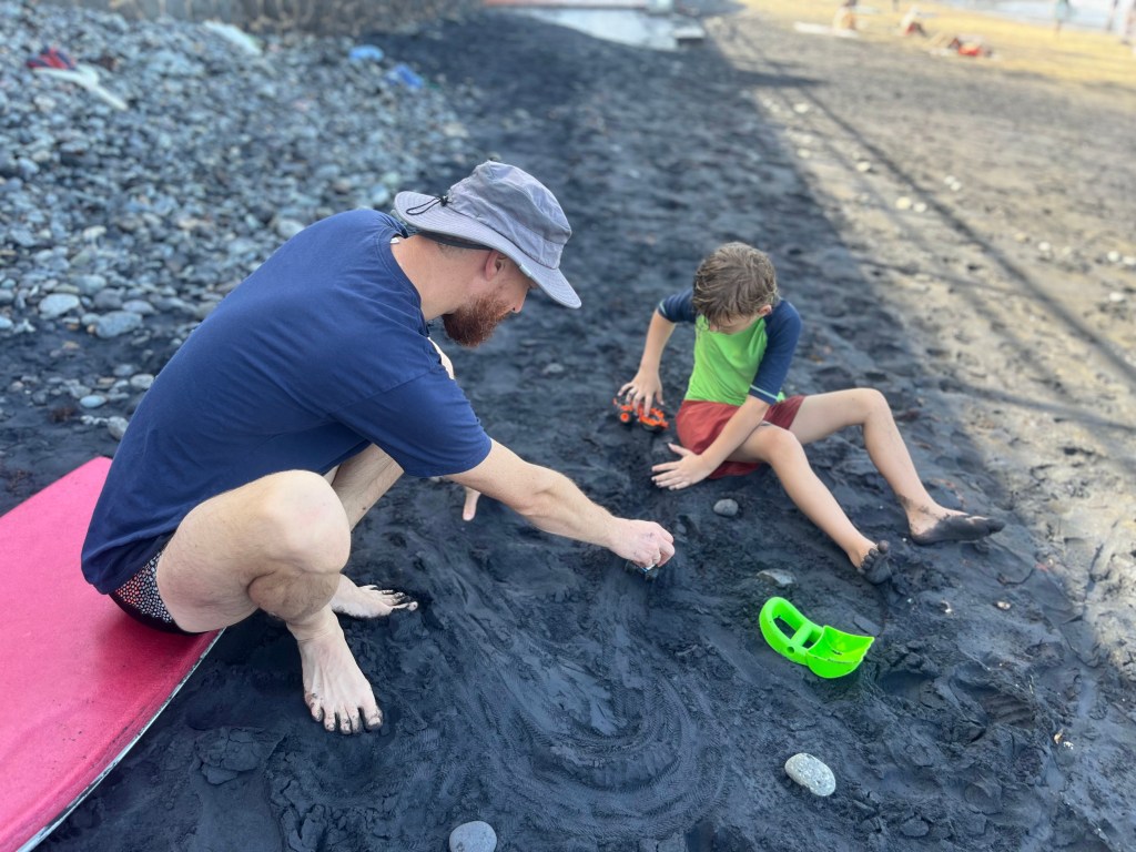 Mali sme ísť do akvária, ale zmenili sme plán a strávili sme doobedie opäť na pláži. Tentokrát jazdil na doske aj ocko aj maminka. Celkom zábava.