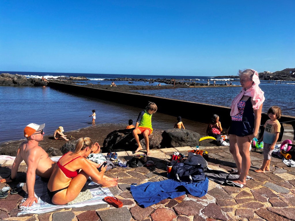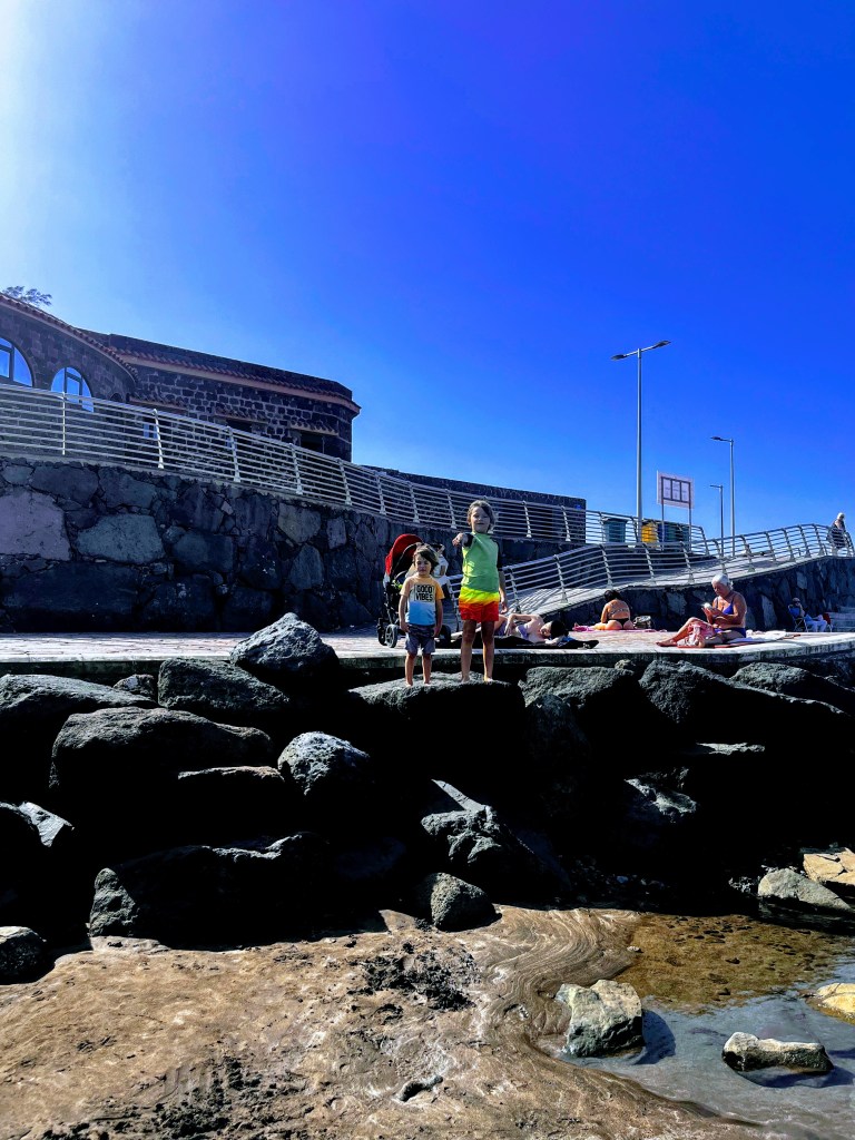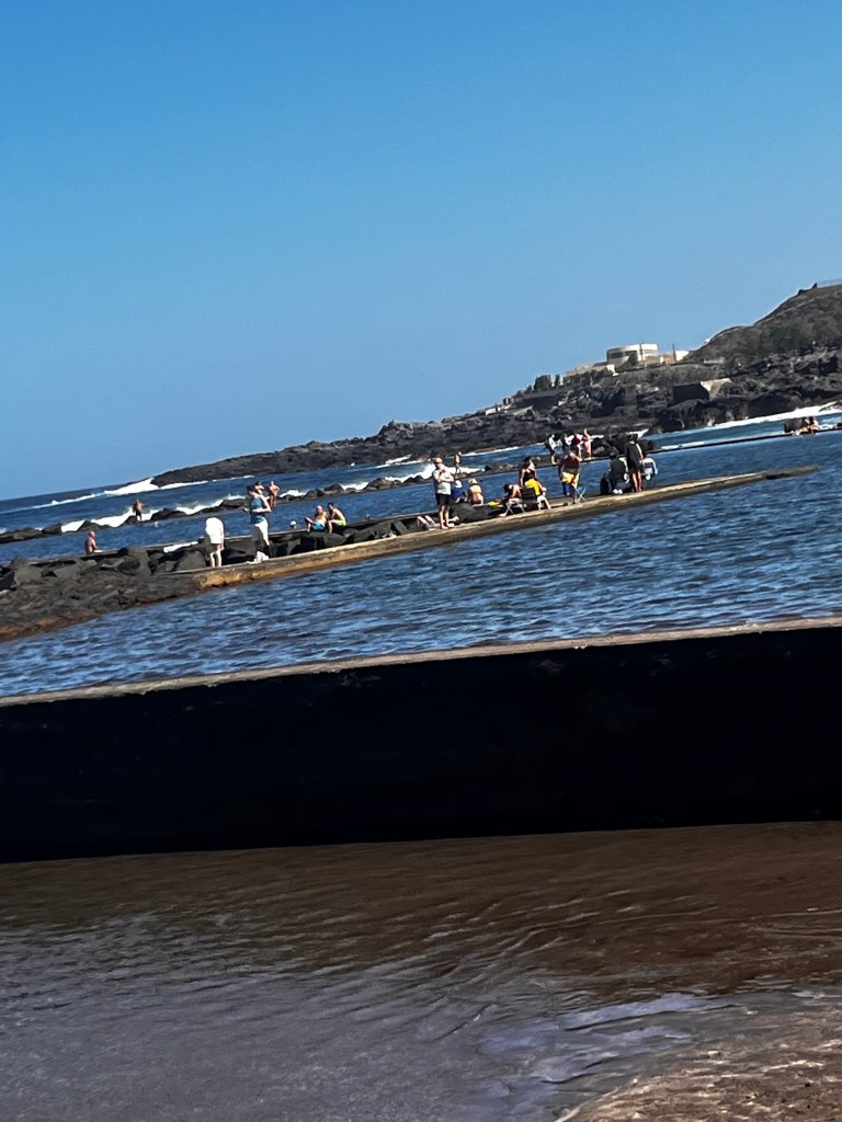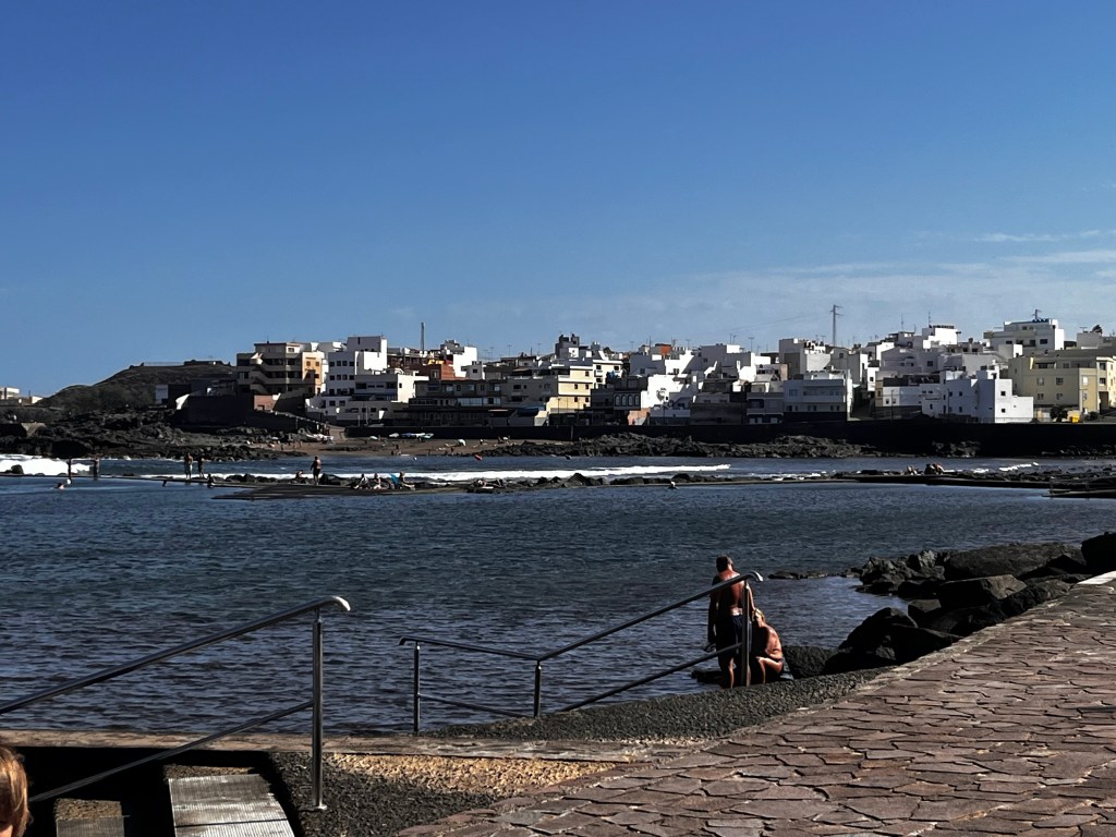 Bolo to jedinečné miesto Los Charcones De Bañaderos, ktoré nebolo preplnené turistami, čo som ocenila. Nájdete ho na tejto mape: odkaz na Google Maps. Pláž je známa svojimi prírodnými bazénikmi vytvorenými vulkanickými skalami, ktoré chránia vody pred prílivom. Hĺbka vody dosahovala len po pás, takže ideálne miesto pre deti (a možno aj trochu bojazlivých plavcov).