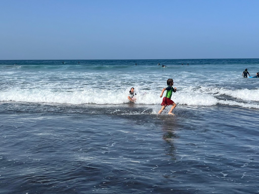 Vlny boli ideálne na bodyboarding, takže každý z nás si vyskúšal jazdu na doske. Dokonca aj ja som dostala možnosť vyskúšať surf, keďže Anna mala po ruke dosku. Skúšala som sa postaviť, no skončilo to prevažne “jazdou” na bruchu alebo častým kúpaním vo vode. Napriek tomu to bola dobrá zábava!